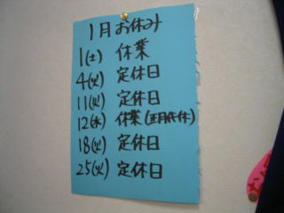 1月の定休日です。お出かけになる際は是非ともご確認下さい。