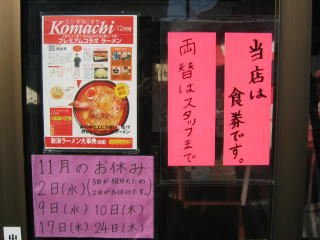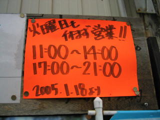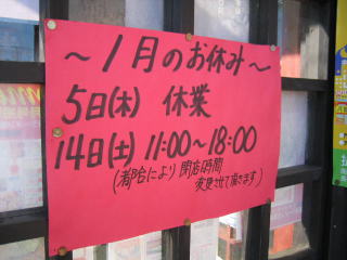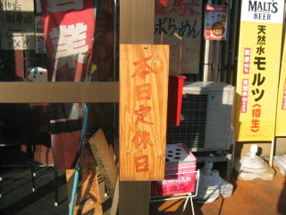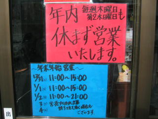 ご主人が見えないので、若い店員さんに聞いてみましたら「年越しラーメンやっていたため、今日はお休みです。」とのことでした。