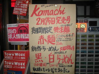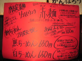 今日はカウンター席です。店内暖簾の下にお知らせ貼り紙があり、赤麺、黒らーめん、白らーめんと話題一杯です。