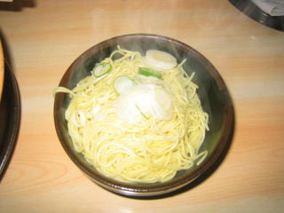 箸で麺を泳がして替玉白らーめん、完成です。