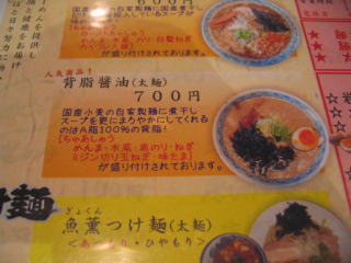 醤油、味噌、つけ麺とありますが、迷わず「背脂醤油(太麺)」700円の大盛無料にします。