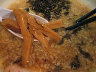 ネギ、水菜、チャーシュー、半煮玉子、太いメンマ、そして岩海苔が乗っています。