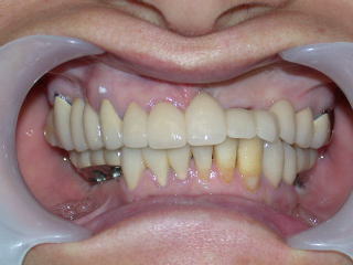 こちらのケースは左上の保険外延長ブリッジのロウ着部分が破損のためインプラントを入れて3歯連続冠にしました。