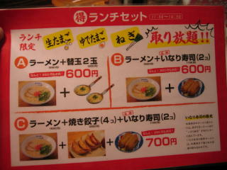今日はもう1軒行くつもりなのでA:替玉2玉は無理、C:餃子がかぶる、Bのいなり寿司600円にしました。