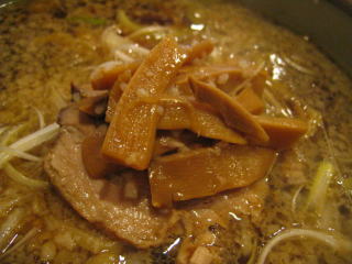 麺は中太縮れ麺、メンマが甘しょっぱくて美味しい。
