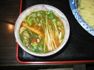 つけダレは梅の香りがサッパリとした濃厚スープ、カイワレ、極太メンマ、チャーシューの塊、など入っています。