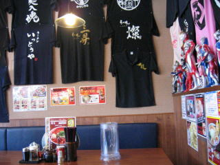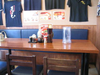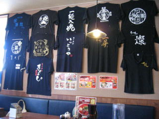 お店左側にはテーブル席、ラーメン店のTシャツがたくさん掛けてあります。