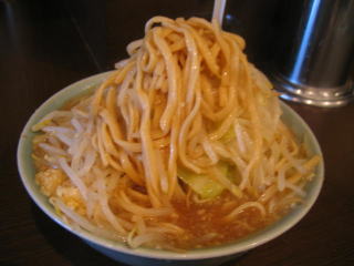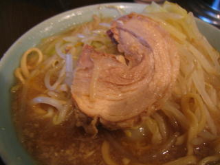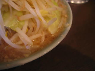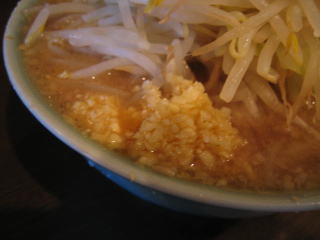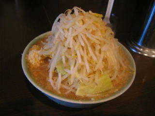 山のようにモヤシが載った、荒めに刻んだニンニクの入ったラーメンが出てきました。