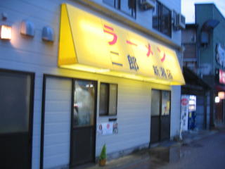 「ラーメン二郎」特有の黄色い看板です、奥の両引き戸が入口です。