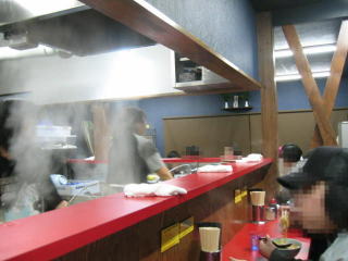 多少野菜や麺がカウンターに落ちても気にせずに、落ちた野菜や麺を拾って食べ続けます。