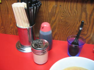 薬味は極めてシンプル、胡椒と味を濃くするカラミのみです、箸は2種類用意されています。