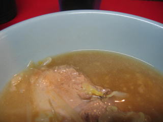 熱々で湯気が立っています、トッピングのニンニクをスープに溶かし込んで頂きます。