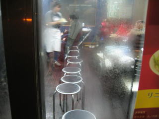 店内をのぞいてみます、右手に4人掛けテーブル席2席、中央の丸椅子は待合席です。