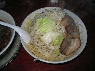麺の上にモヤシとキャベツが山盛りで麺が見えません。
