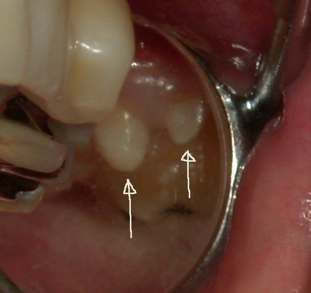 今度は左側の上の第二大臼歯の外側に歯が出てきました。それも二本です。