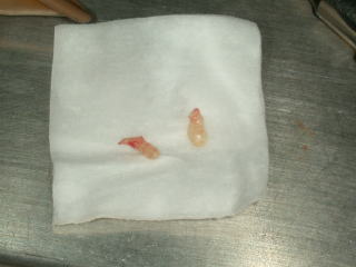 抜去した二本の過剰歯です。その後消毒に来院した時「痛みは嘘のように消えました。」とのお話です。良かったです。