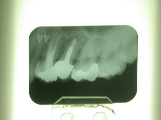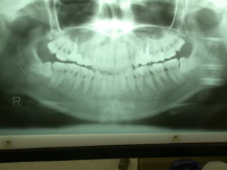 通法とおりレントゲン写真を撮影し、歯根の状態を確認します。このような場合反対側も同様な場合も多いと思われますが、右側は特に異常は認められませんでした。