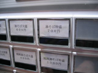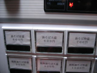 お店入ると左手に券売機です、メニューは基本「油そば」と「焼豚油そば」のみです。