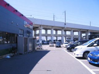 すぐ近くに新幹線の高架線があります、大通りに赤い看板のたぶん「豚しゃもじ」さんも見えます。