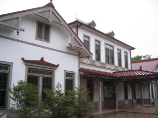 黄色い壁の三角屋根3つの左側が矢ケ崎公園です。