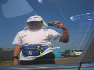 レガ男のリアクォーターガラスに写る姫ちゅ、日よけ帽子にタープt、ウエストポーチに500mlのスポーツ飲料を入れています。