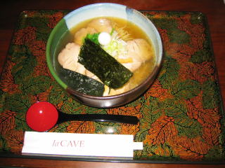 花水の中のラ・カーダでチャーシューメン大盛り930円を頂きました。塩ラーメンに近い様な色のあっさり醤油ラーメンです。麺は縮れ細麺、チャーシュー5枚、のり2枚、うずらのたまご、ほうれん草、メンマ、刻んだ長ねぎです。普段は何も掛けない姫ちゅですが少しスープが寂しくてコショウを掛けました。細麺は早く食べないと延びてくるので大急ぎで完食しました。ラーメンの盛り合わせ、お盆や器、レンゲもセンスの良さを感じるお店です。箸入れ一つに関してもです。