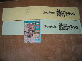 参加賞のマフラータオル2枚、他にチオビタドリンクと玉露の缶のお茶もいただきました。