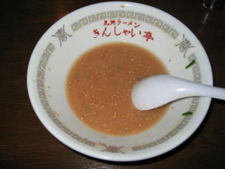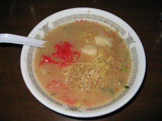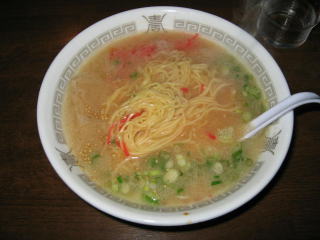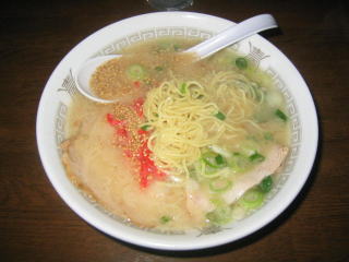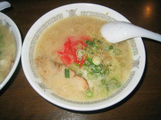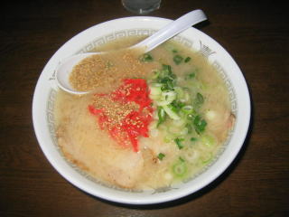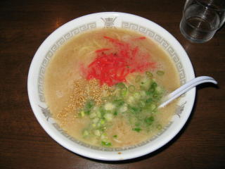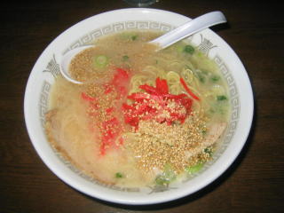 九州ラーメンですから、とんこつスープ、細麺、紅生姜、白ゴマです。