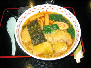 縮れ中太麺にアッサリ醤油スープが絡みます。