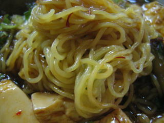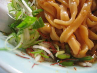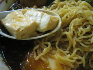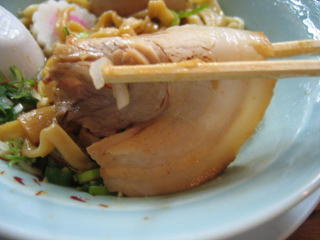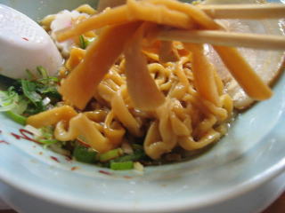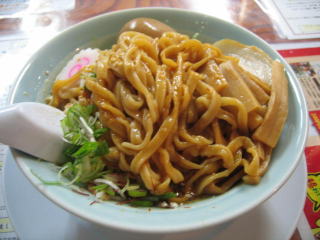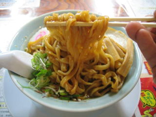 油の効いた、濃い目の醤油ダレが極太麺と絡んでとても美味しい。