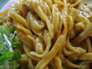 麺は茶色い平打ちの極太麺です、燕の有名店を思い出します。