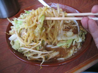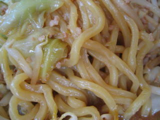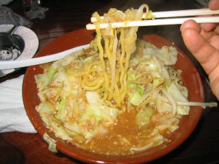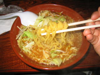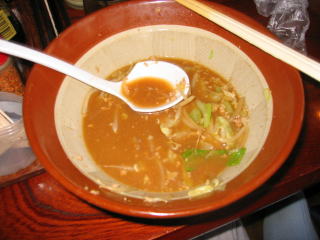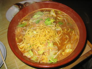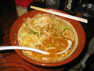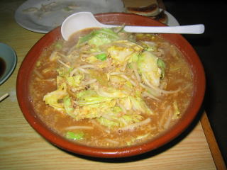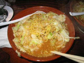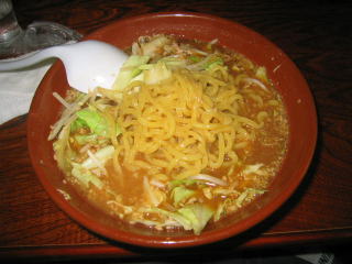 まずビックリなのはその量の多さです。何の気なしに「味噌らーめん大盛り」と言ってしまいました。写真では分からないと思いますが、出てきたすり鉢(どんぶり)の大きいこと大きいこと。絶句しました。モヤシ、キャベツもたっぷりです。ちょっと食べる前にどかして麺を見てみました。黄色の縮れ中太麺でコシありです。スープはピリ唐の味噌味、汗が知らず知らずの間に噴出してきました。ひき肉が下にたくさん沈んでおり、でっかいレンゲ?ですくって食べました。餃子もモチモチとして美味しく、ごぼうサラダもシャキシャキとした歯ごたえで美味しかったです。