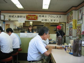 目を引くのはプロレスの写真、ポスター、多数の張り紙です。
