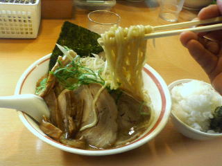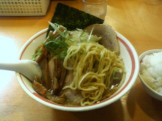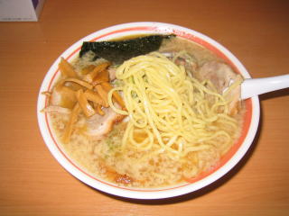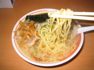 スープはちょっと味が薄いかな、もう少し濃いめが好きです。麺は縮れ中太麺。