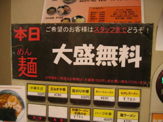 「大盛無料」ですが持参のクーポンで「特盛無料」です。