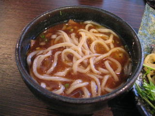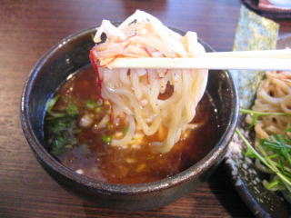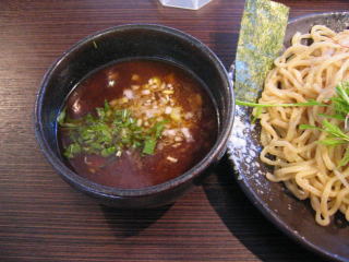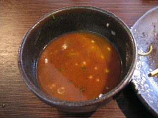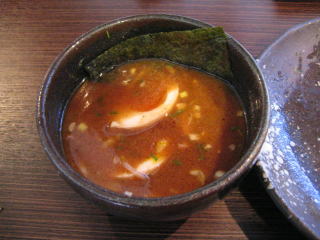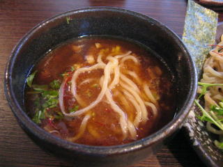スープは鰹節や鯖節などの節が効いた、ザラツク感じのある、熱いつけダレです。