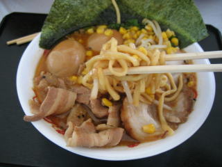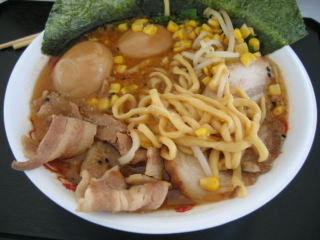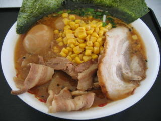 味玉2個、コーン豚バラチャーシュー、カリカリのベーコンの様なチャーシューと具だくさんです。