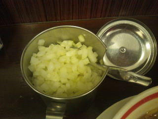 カウンターの上の方、刻んだ玉ねぎが無料で提供されています。