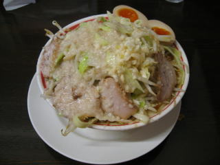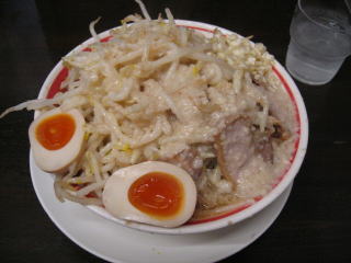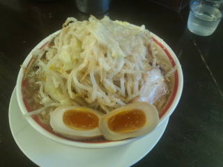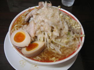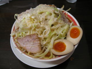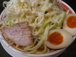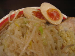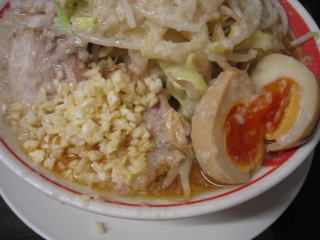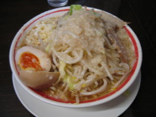 比較的短時間で「こってりラーメン野菜マシ、あぶらマシマシのニンニクマシマシ」味玉(無料券持参)が来ました。