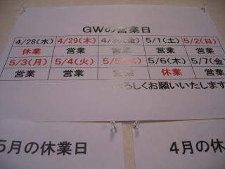 「GWの営業日」です、4月28日(水)と5月6日(木)がお休みです、他は営業しています。