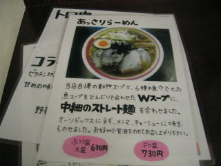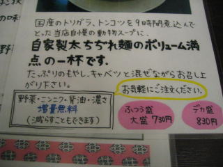 「あっさりらーめん」ふつう盛、大盛630円もあります。