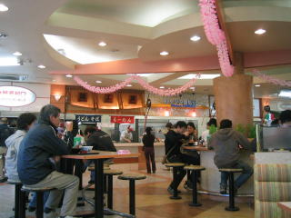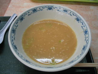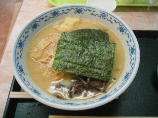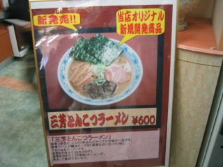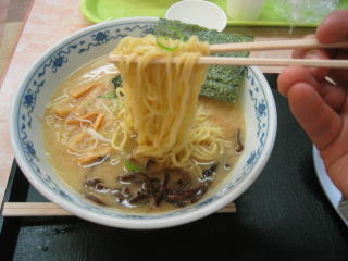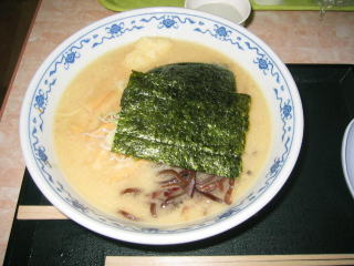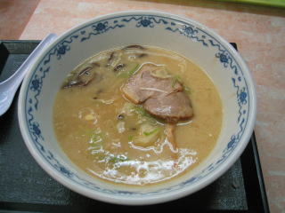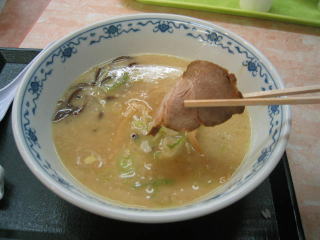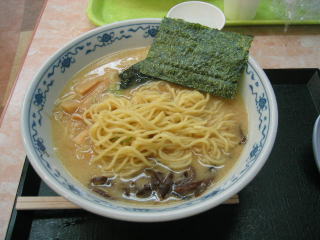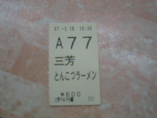 平成19年3月 埼玉県三芳町の関越自動車道下り三芳SAにお邪魔しました。 (平成19年の15杯目ラーメンです。) 「三芳とんこつラーメン」600円をいただきました。 券売機で食券を購入します。 日曜日の夕方で、比較的混んでいます。 のり、キクラゲが入って、背脂の浮いたとんこつラーメンです。麺は普通の中太麺です。 チャーシュー1切れいただきます。 背脂入りのとんこつスープです。