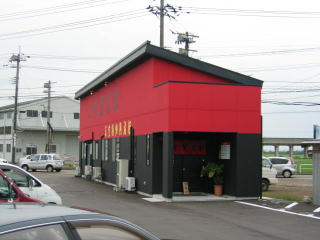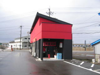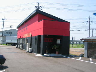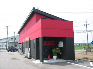 長岡側から見た建物、赤、黒、黄色で気合を感じます。
