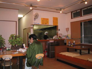 お店の雰囲気、タオルを頭に巻いたご主人がラーメン作っています。テーブル席、小上がり席もあります。