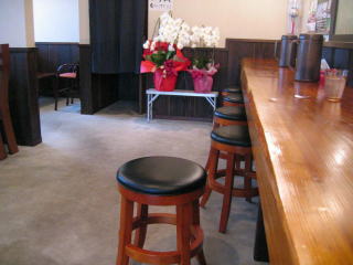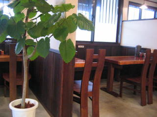 玄関室には券売機、その先、右手奥に厨房とカウンター席、窓際にもカウンター席とテーブル席です。