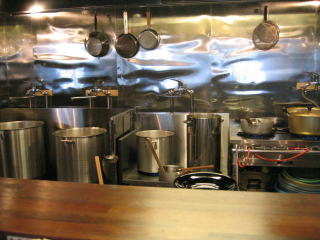 綺麗な銀ピカの厨房、大きな寸胴が4つ、大きなお鍋も2つ見えます。