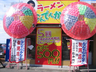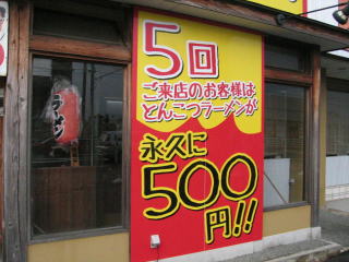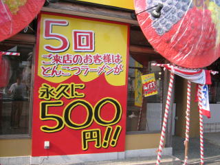 「5回ご来店のお客様はとんこつラーメンが永久に500円!!」と書いてあります。