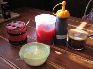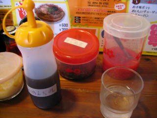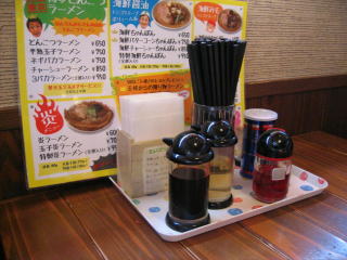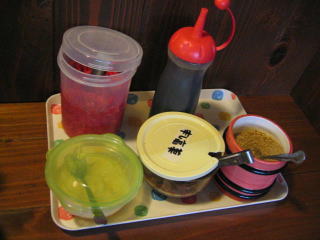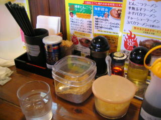 薬味類は白ゴマ、紅生姜、辛い高菜、おろしニンニク、ラーメンたれなどです。