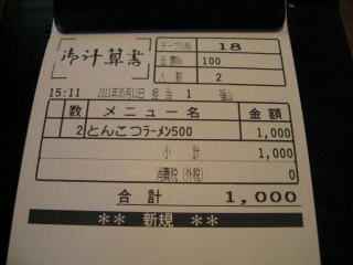 前回いただいた赤いカードを使って「とんこつラーメン」500円です。