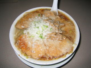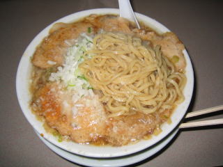 コッテリしょうゆ味の濃いスープにチャーシュー、玉ねぎ、長ねぎ!メンマ、大量の白い背油が降りかかっています。